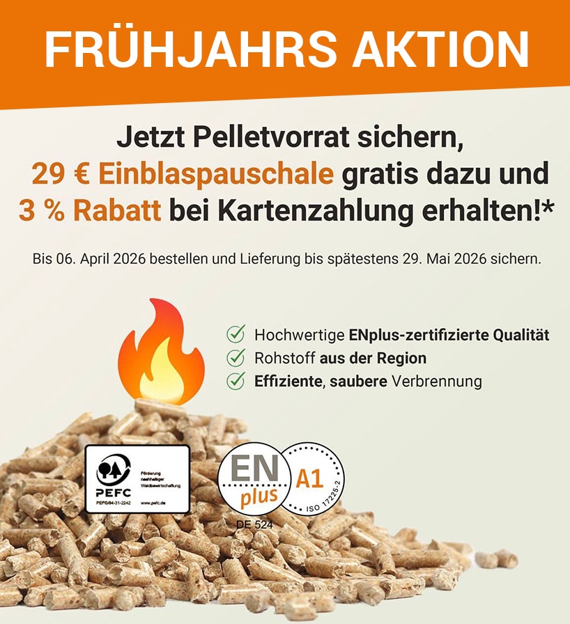 *Bestellen Sie bis zum 06.04.26 mit dem Stichwort „Frühjahrsaktion 2026“. Das Angebot gilt einmalig pro Haushalt p.A. und ausschließlich für lose Ware im Tankzug bei einer Mindestabnahme von 3to.. Lieferung max. bis zum 29.05.2026. Diese Aktion ist auf eine Gesamtmenge begrenzt und wird beendet, sobald das Kontingent erreicht ist (möglicherweise vor dem 29.05.2026).