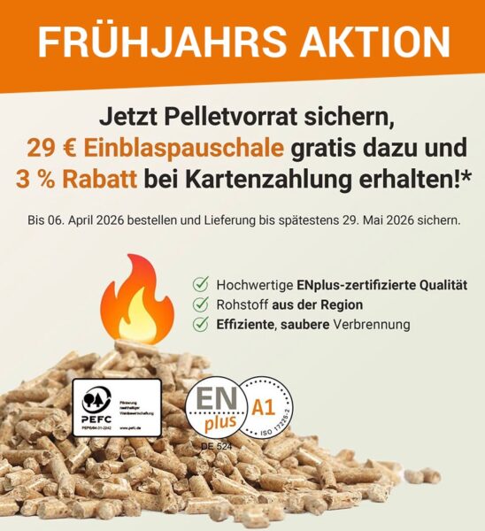 Bis 06.April 2026 Thermospan Holzpellets zu Frühjahrspreisen bestellen und Sie bekommen die Schlauchpauschale im Wert von 29€ geschenkt! Weitere 3% Rabatt erhalten Sie bei Kartenzahlung.*